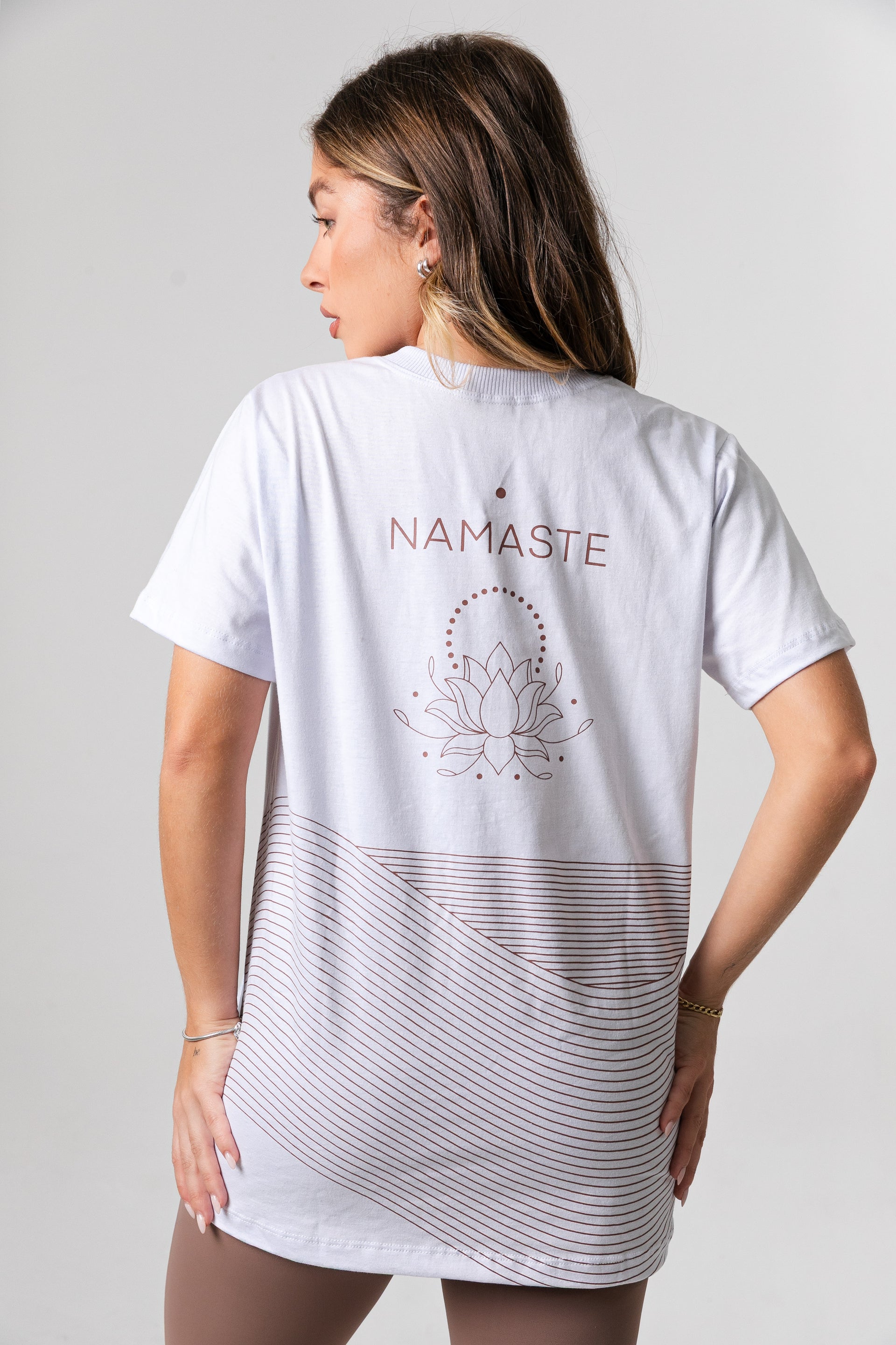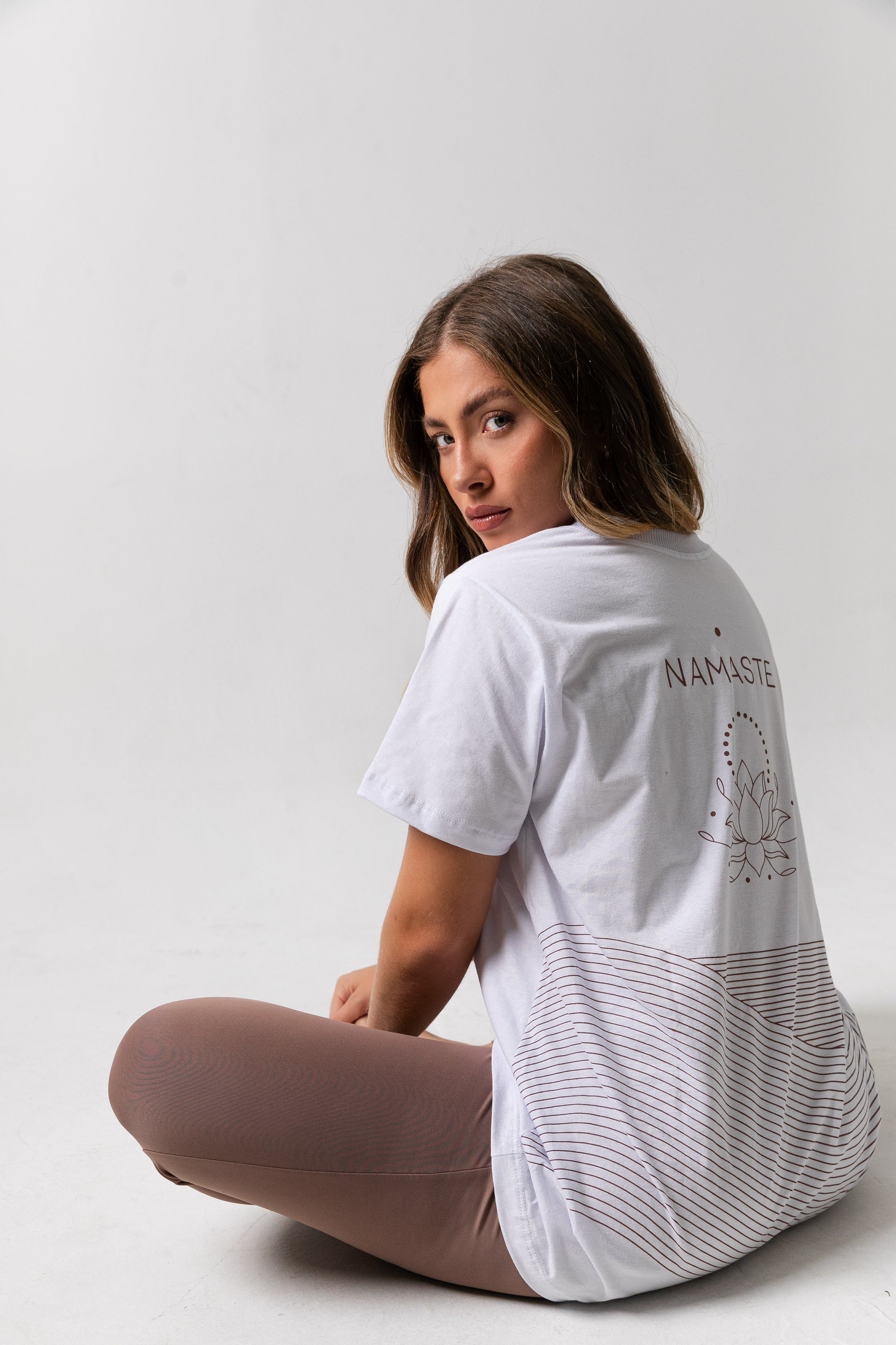 - Estampa exclusiva “Namastê”: arte única nas costas com a palavra NAMASTE & uma flor de Lotús, símbolo tradicional do Yoga