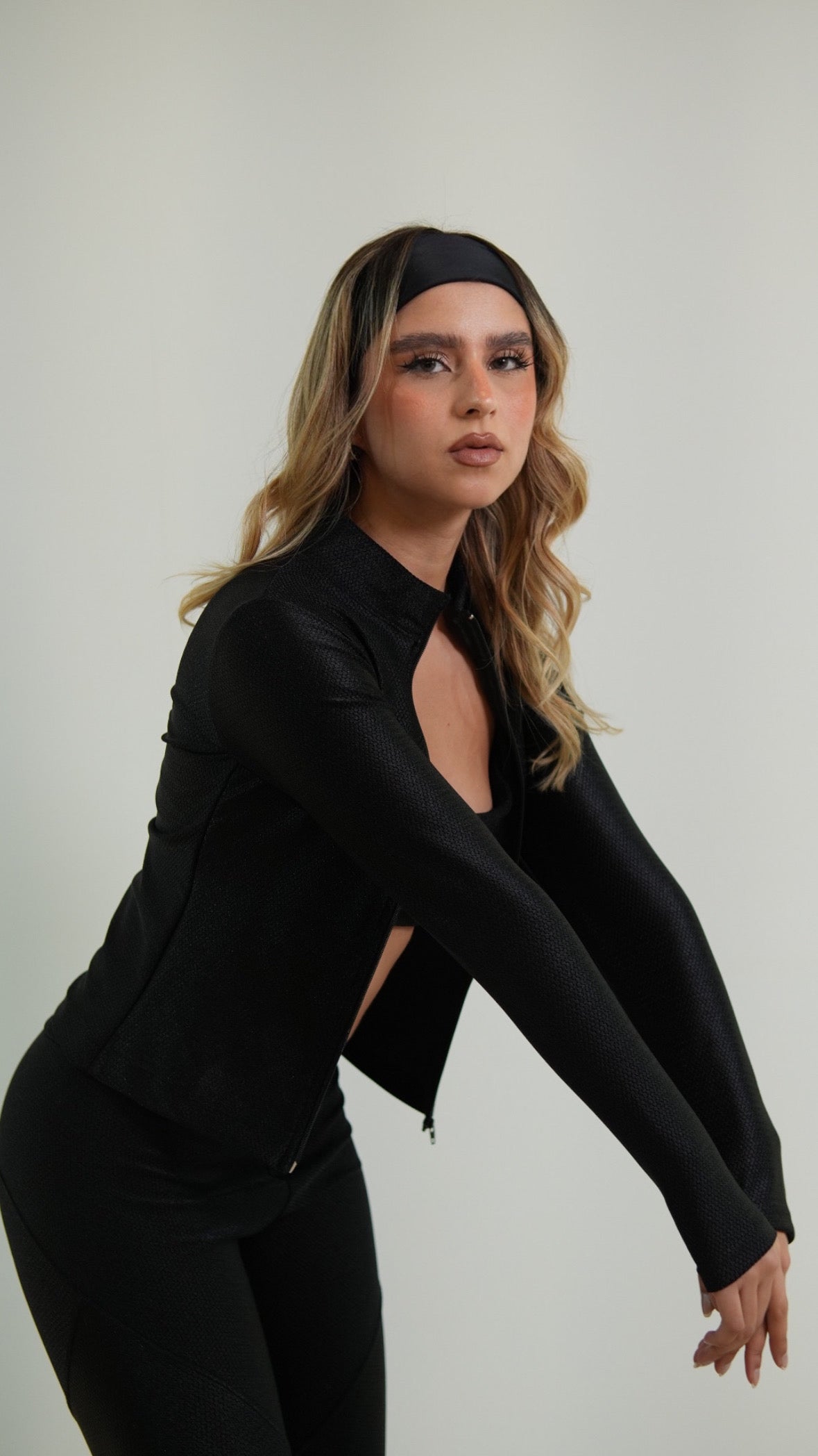 Design Athleisure - A jaqueta longuete apresenta modelagem exclusiva e incrivelmente linda, com comprimento até a cintura, gola raglan, abertura frontal com zíper, detalhe com dedeiras no punho e o destaque para o tecido texturizado levemente brilhoso. É uma peça prática, ideal para o seu treino, além de ser super estilosa para looks #outfit.