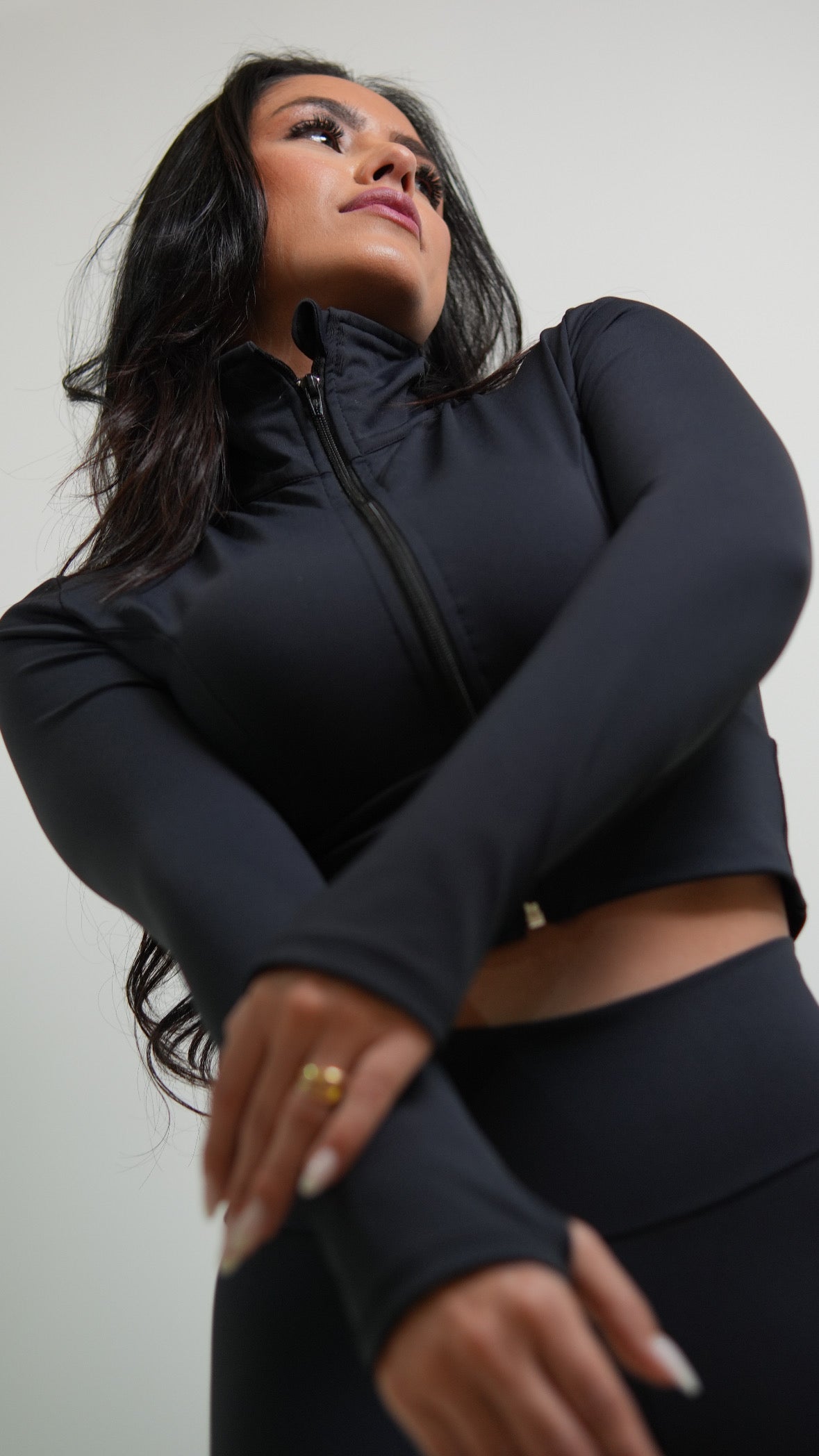 Design Athleisure - A jaqueta apresenta modelagem exclusiva e incrivelmente linda, com gola alta, abertura frontal com zíper, comprimento cropped e detalhe cou dedeiras no punho. É uma peça prática, ideal para o seu treino, além de super estilosa!